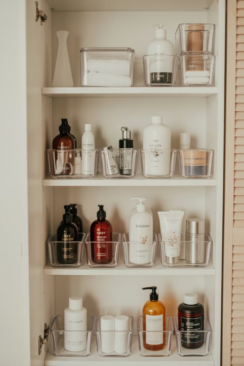 Your bathroom cabinets can quickly become a cluttered mess. Start by taking everything out and checking expiration dates on products. Toss what you don’t need, and organize the rest by category for a fresh start!