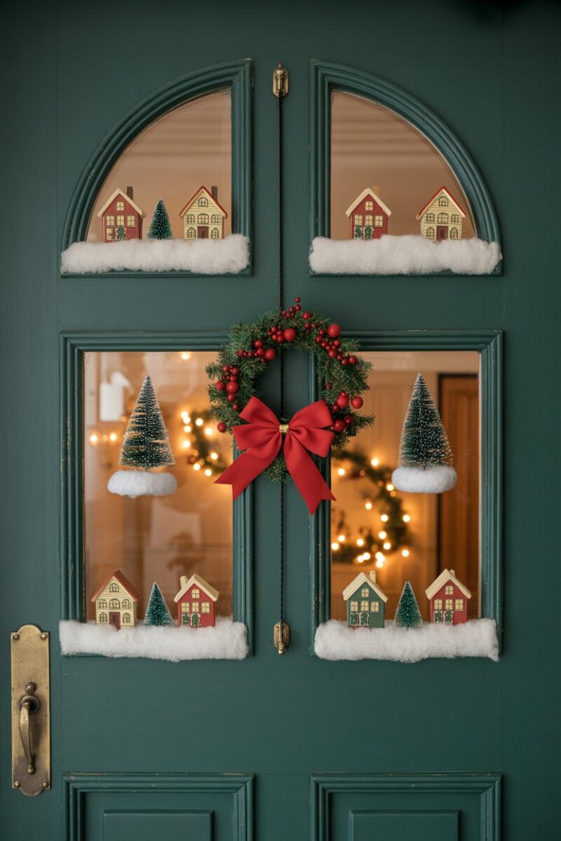 A Christmas village scene adds charm to your door. Miniature houses and tiny trees create a cozy vibe. It’s a fun way to welcome guests during the holiday season!