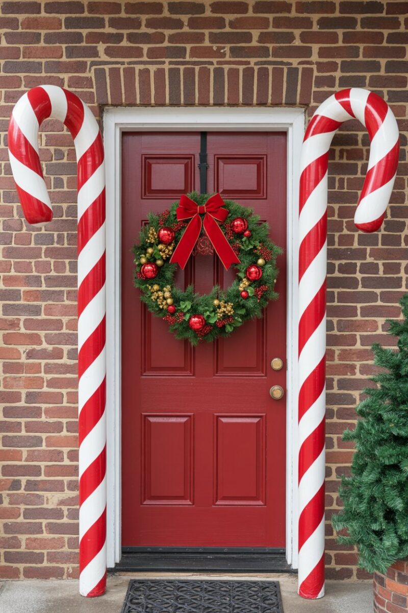 Get into the holiday spirit with candy cane decorations that are sure to catch everyone’s eye. Large, colorful candy canes framing your door create a fun and festive vibe. Pair them with a cheerful wreath for a complete look that spreads joy to all who pass by!