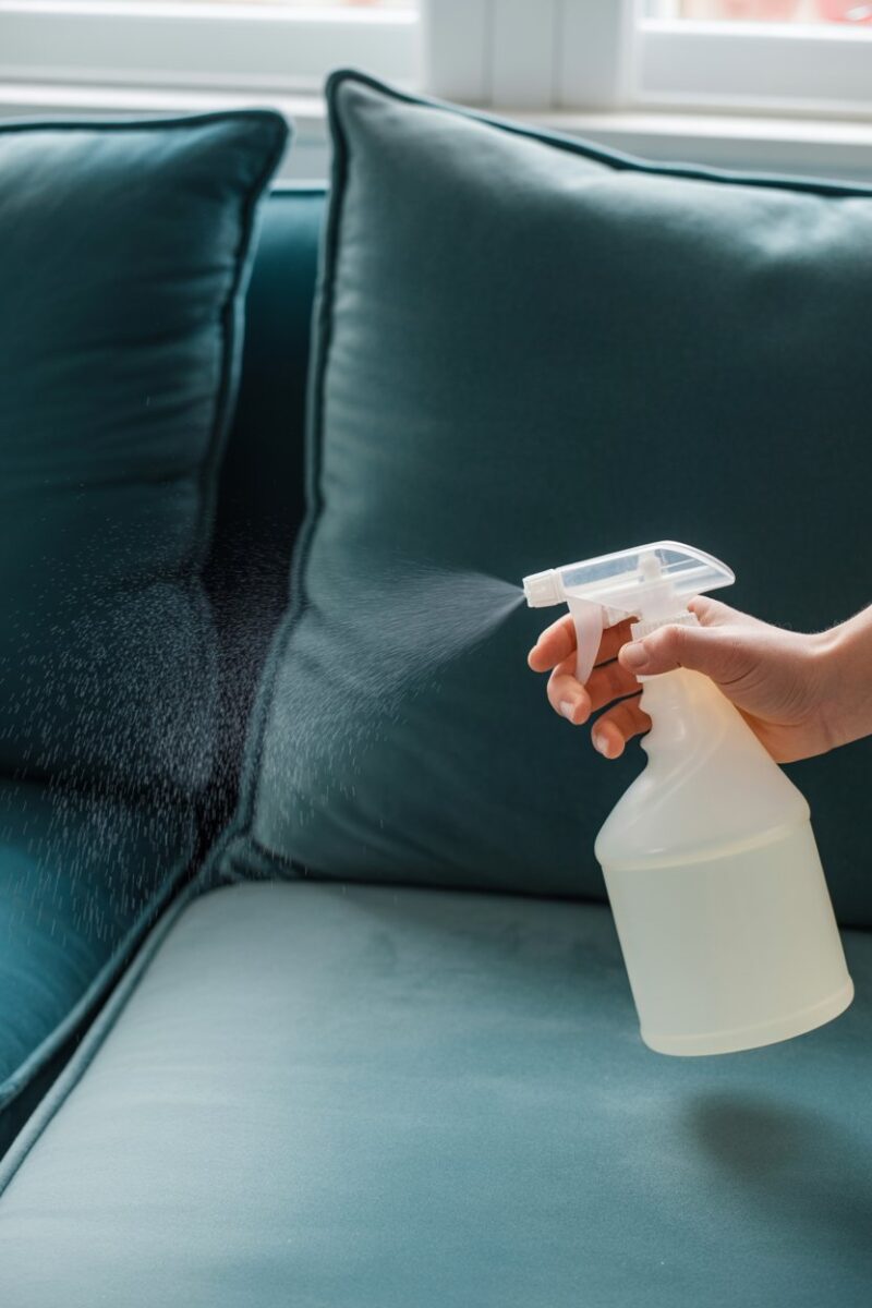 Got a couch that needs some love? Mix equal parts vinegar and water in a spray bottle, then spritz it on the fabric. Sprinkle baking soda on top, let it sit for a bit, and vacuum it up for a fresh, clean look!