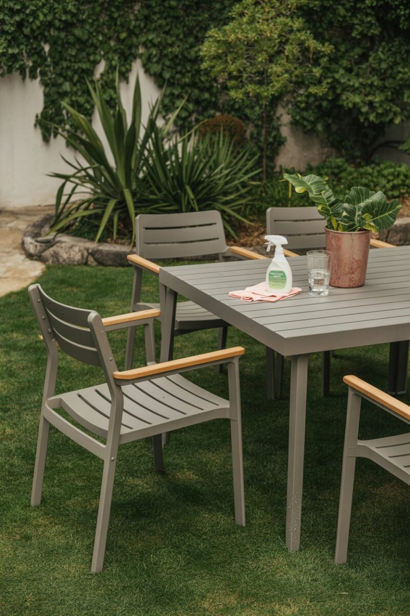 Cleaning your outdoor furniture is super easy with just soap and water. Grab a bucket, mix in some soap, and scrub away any dirt or stains. Rinse it off, and your furniture will look fresh and ready for your next gathering!