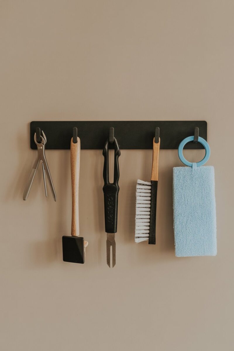 If you’re tired of tripping over mops and brooms, a holder with hooks is a simple fix. This setup keeps your cleaning tools organized and off the floor, making your space look tidy. Plus, it’s super easy to grab what you need when you need it!