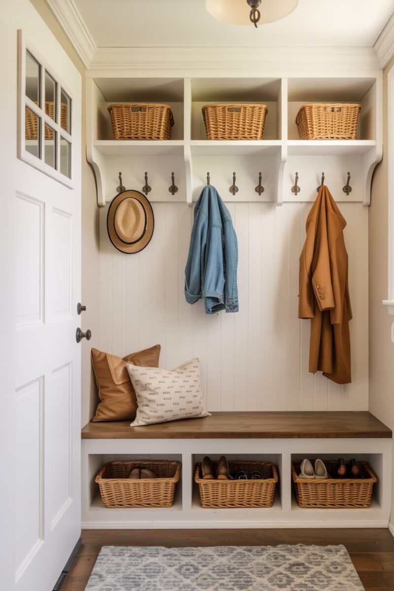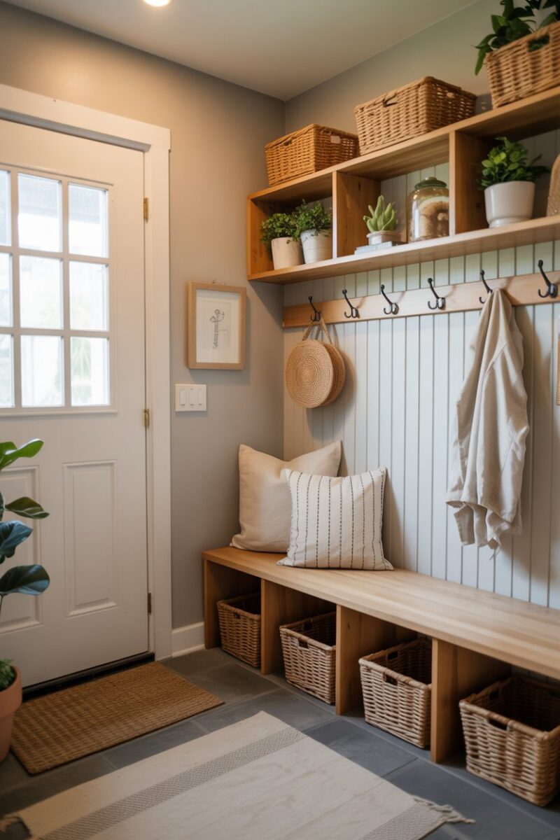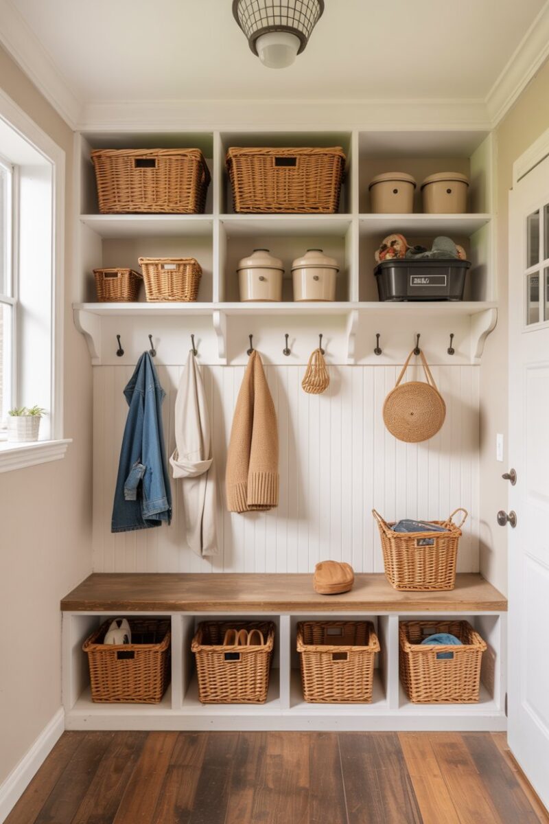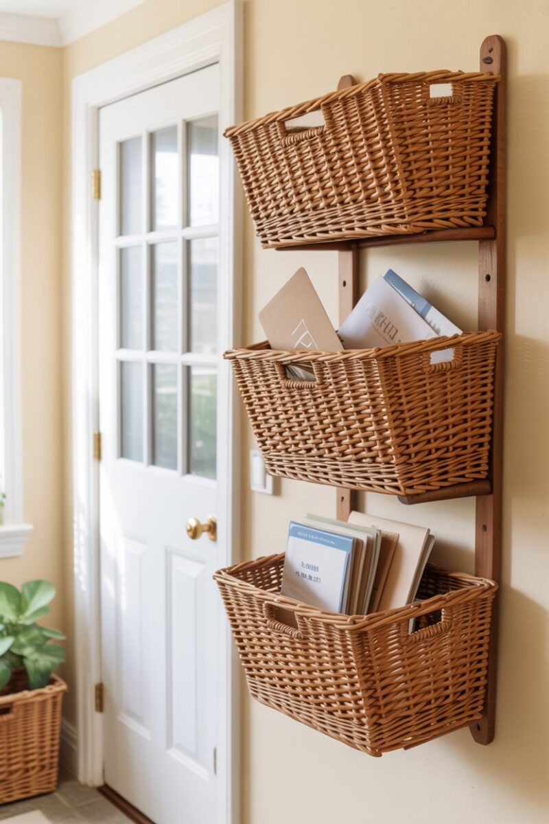 Wall-mounted baskets are a simple way to keep your entryway tidy. They provide a designated spot for mail, gloves, and other essentials, making it easy to grab what you need on your way out. Plus, they save floor space while adding a stylish touch to your mudroom.