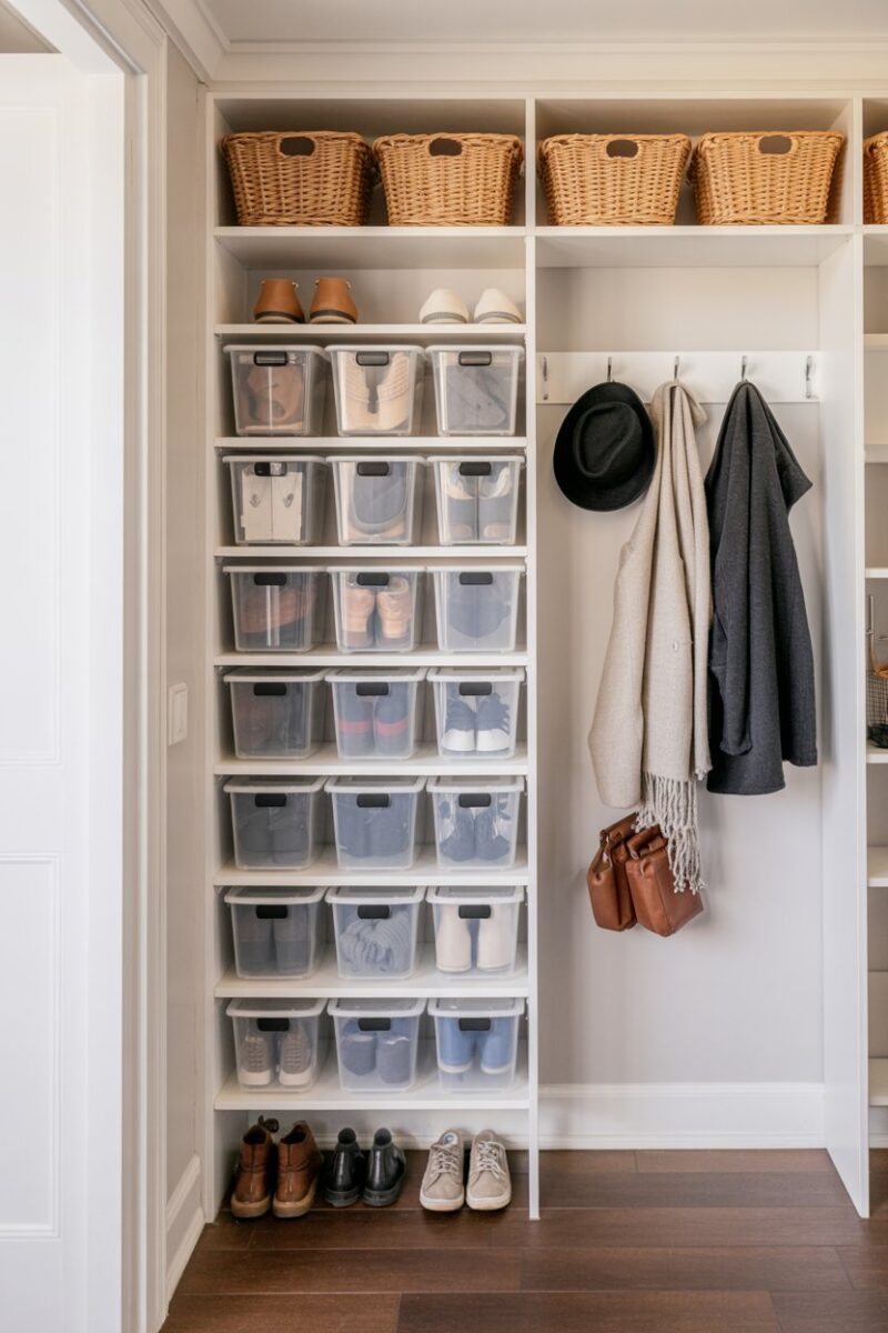 Clear bins are a fantastic way to keep your mudroom tidy and easy to navigate. You can quickly see what’s inside, making it simple to grab what you need on the go. Labeling each bin adds a personal touch and helps everyone in the family know where things belong.