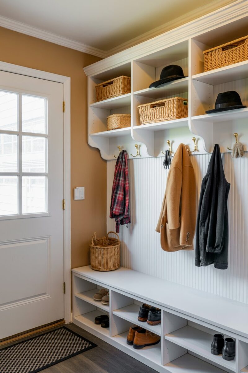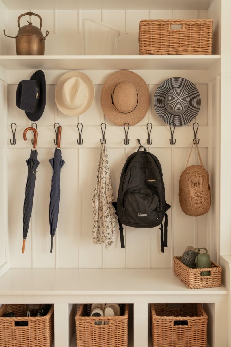 Wall-mounted hooks are a simple way to keep your entryway tidy. They provide easy access to coats, bags, and scarves, making your mudroom functional and stylish. Plus, they save space while adding a touch of charm to your home.