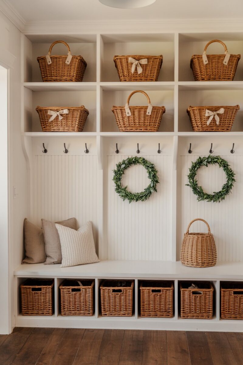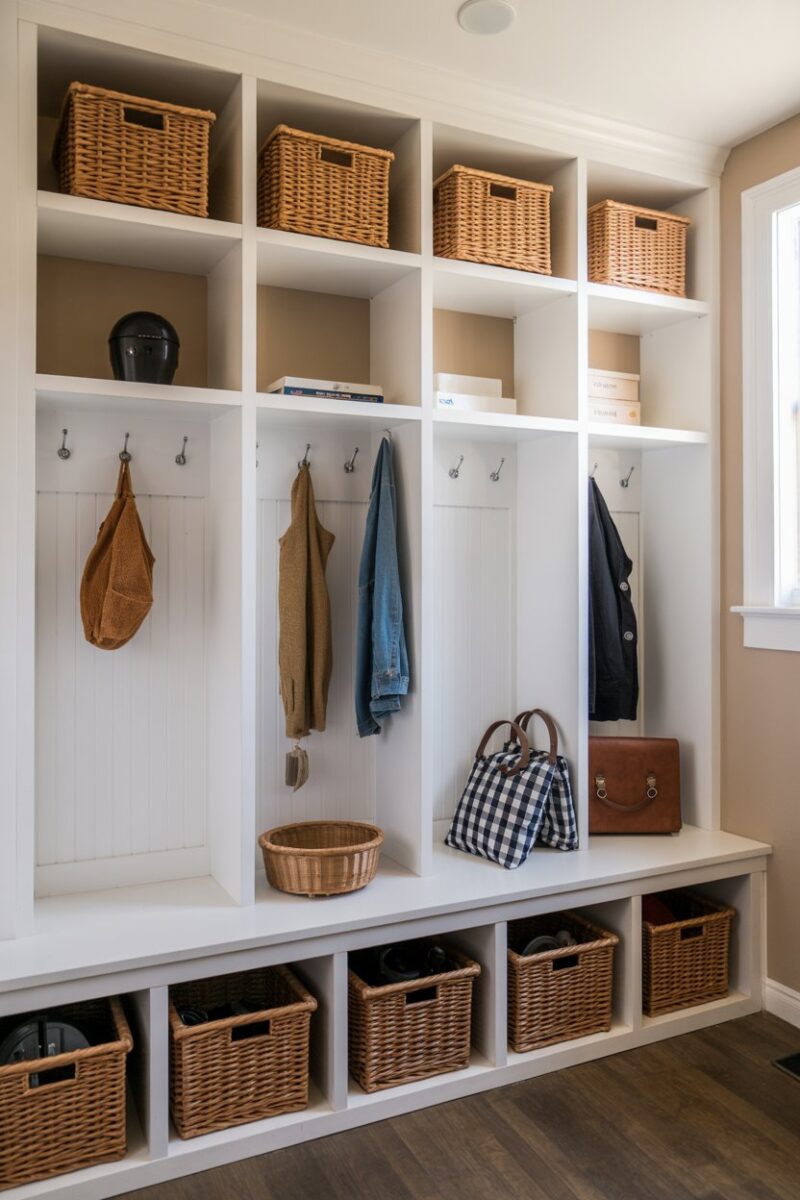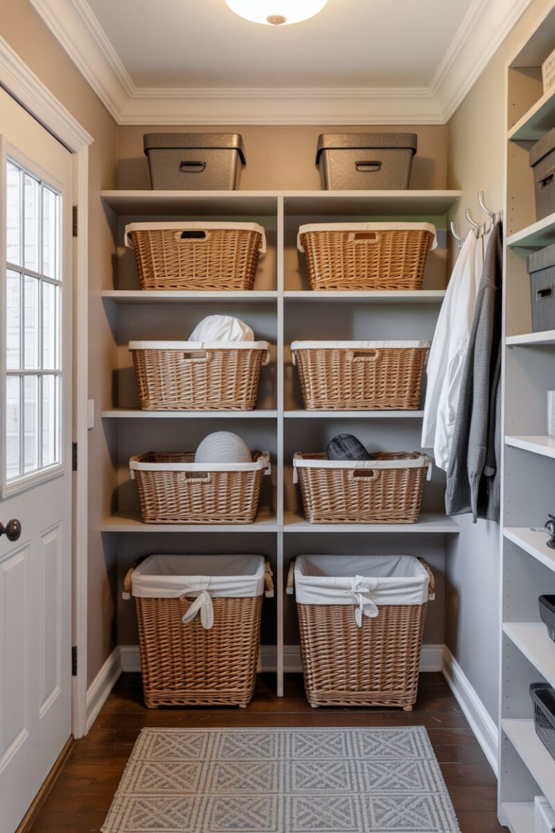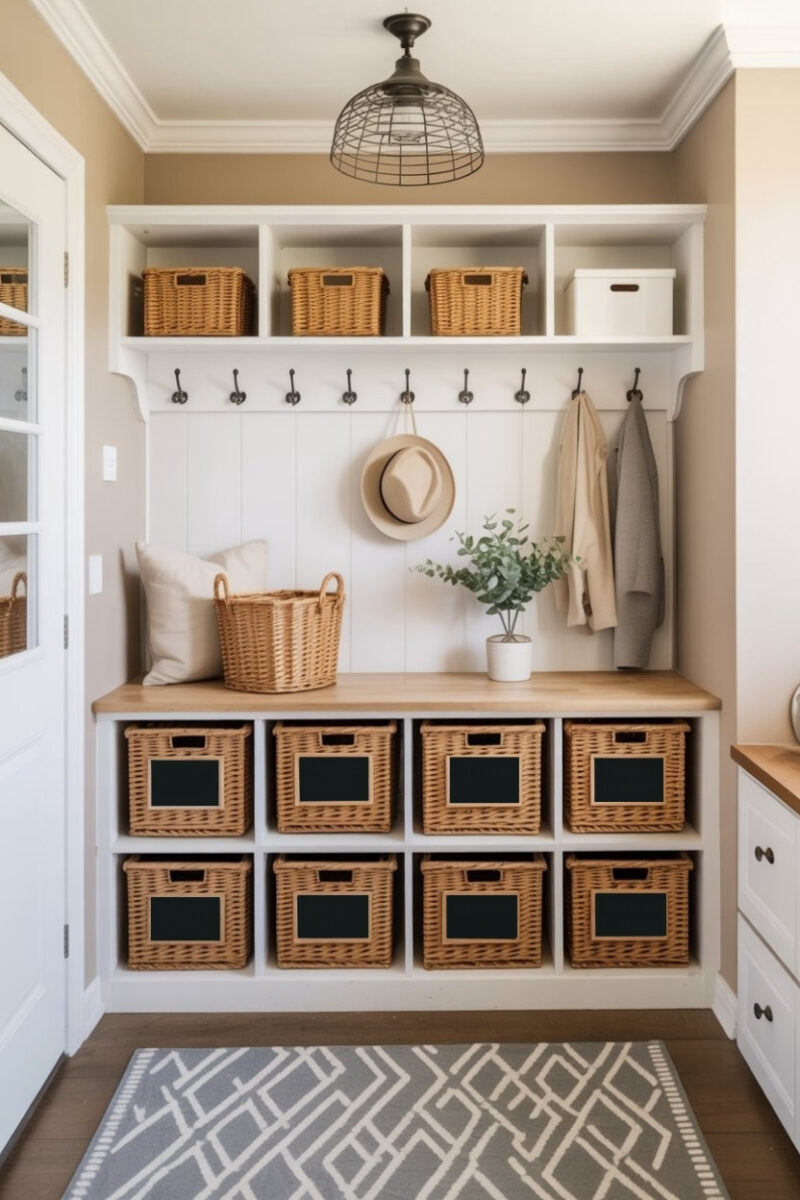 Creating laundry basket stations in your mudroom can make cleanup a breeze. With designated baskets for each family member, everyone can toss their clothes in as they come in. This simple setup keeps your entryway tidy and makes laundry day a lot easier!