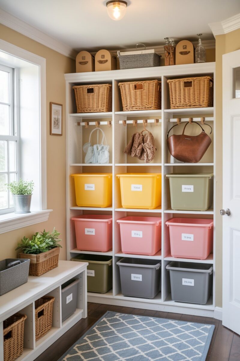 Color-coded storage bins are a fun way to keep your mudroom organized. Each family member can have their own color, making it easy to find their things. This simple system helps everyone stay tidy and makes clean-up a breeze!
