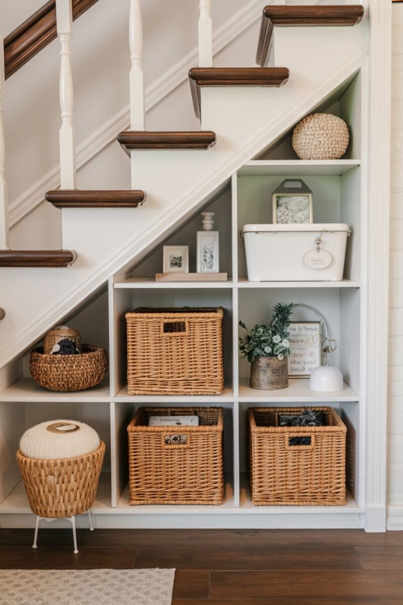 Using the space under your stairs for storage is a smart move. You can fit bins, boxes, or even seasonal decor to keep everything organized. This way, you maximize space while keeping your entryway tidy and stylish.