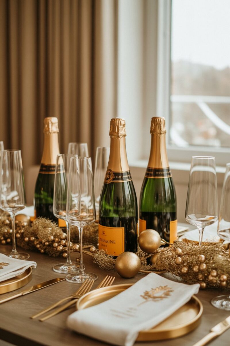 Transform your table with sparkling champagne bottle centerpieces that scream celebration! Use glittery bottles and pair them with festive decorations like gold and silver ornaments for a chic look. This simple touch adds elegance and sets the perfect tone for your New Year’s gathering.