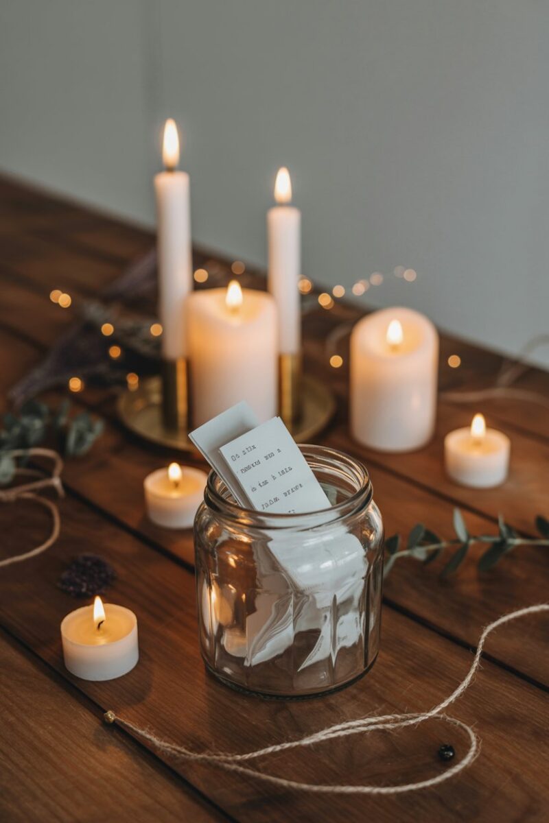 Twinkling fairy light jars are a fun and easy way to add sparkle to your New Year decorations. Just fill some glass jars with string lights, and watch your space light up with a warm glow. They’re perfect for creating a cozy vibe at any gathering!