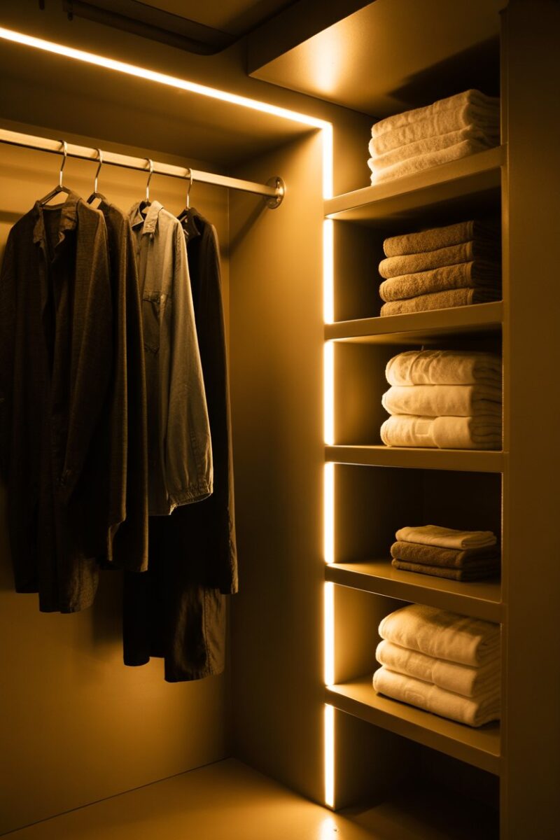 Good lighting can make a small closet feel much bigger. Use LED strips or recessed lights to brighten up every corner. This way, you’ll easily find what you need without rummaging around in the dark.