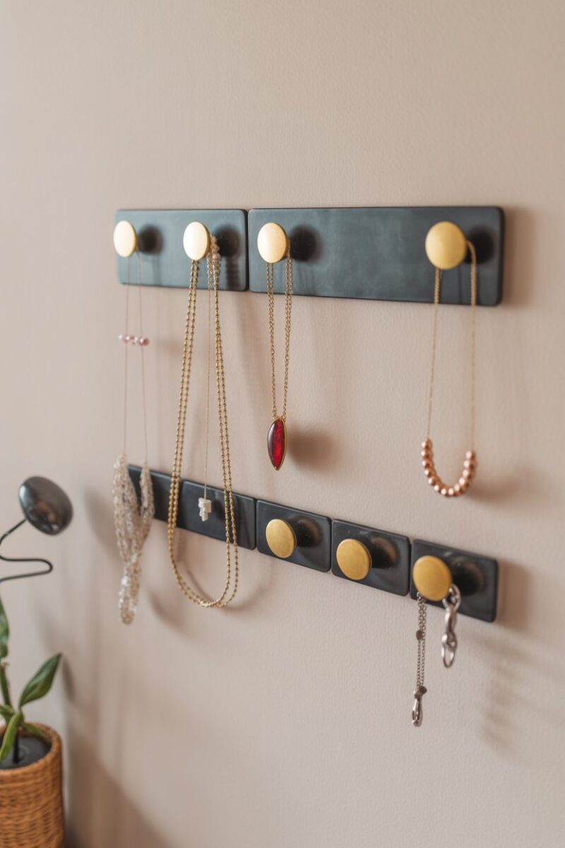 Magnetic strips are a clever way to keep small items organized and easily accessible. You can attach them to the inside of your closet door or on a wall to hold everything from tools to accessories. This simple solution maximizes space and keeps clutter at bay!