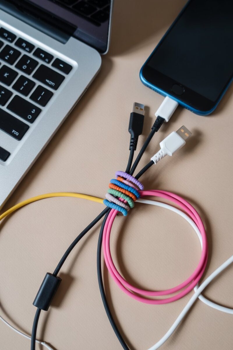 Pipe cleaners can be a fun way to keep your phone chargers and cables organized. Just twist them around your cords to prevent tangling and make them easier to find. Plus, you can add some color to your workspace while keeping everything neat!