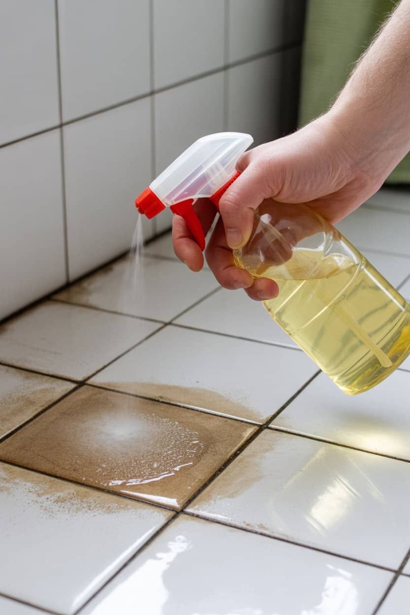 Grout can be a pain to clean, but vinegar makes it easier. Just mix equal parts vinegar and water in a spray bottle, spray it on the grout, and let it sit for a few minutes. Scrub with a brush, and you’ll see the difference right away!