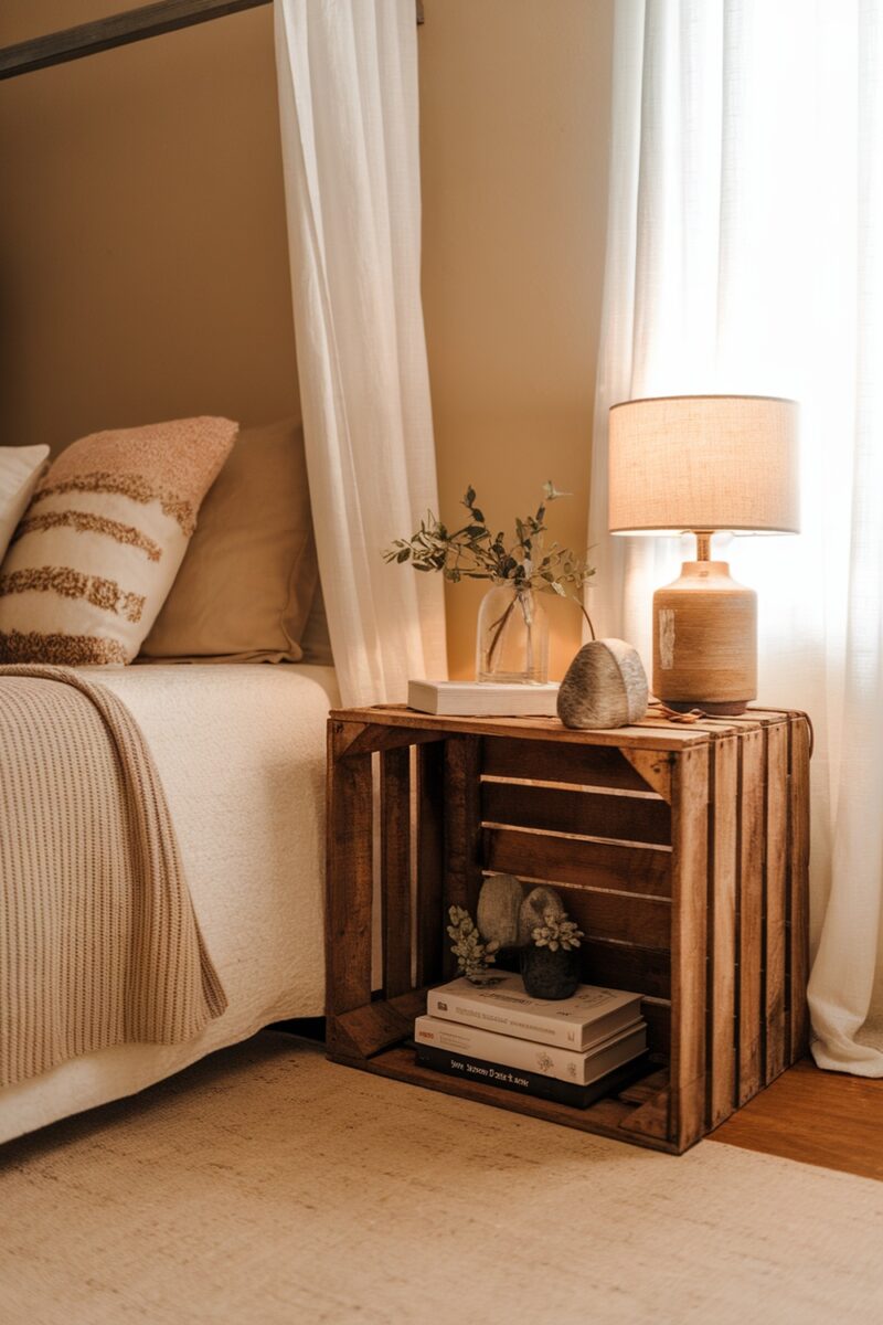 Using a wooden crate as a side table is a fun and easy way to add charm to your space. It brings a rustic vibe that pairs perfectly with cozy furniture. Plus, you can store books or plants inside for a stylish touch!